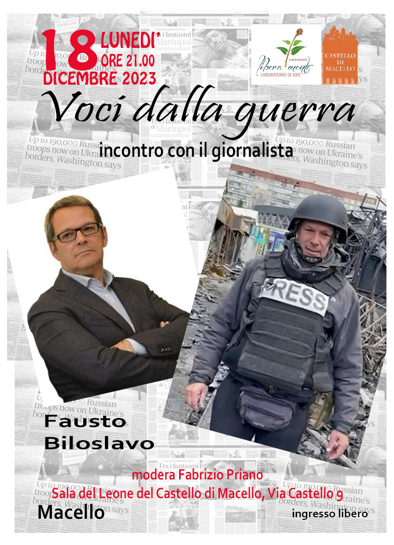 Lunedì 18 dicembre, alle ore 21, nel Castello di Macello, in via Castello n. 9, incontro con Fausto Biloslavo, giornalista, che da quarant’anni racconta le guerre scoppiate nel mondo, dall’Afghanistan all’Estremo Oriente, dall’Africa ai Balcani, all'Ucraina.